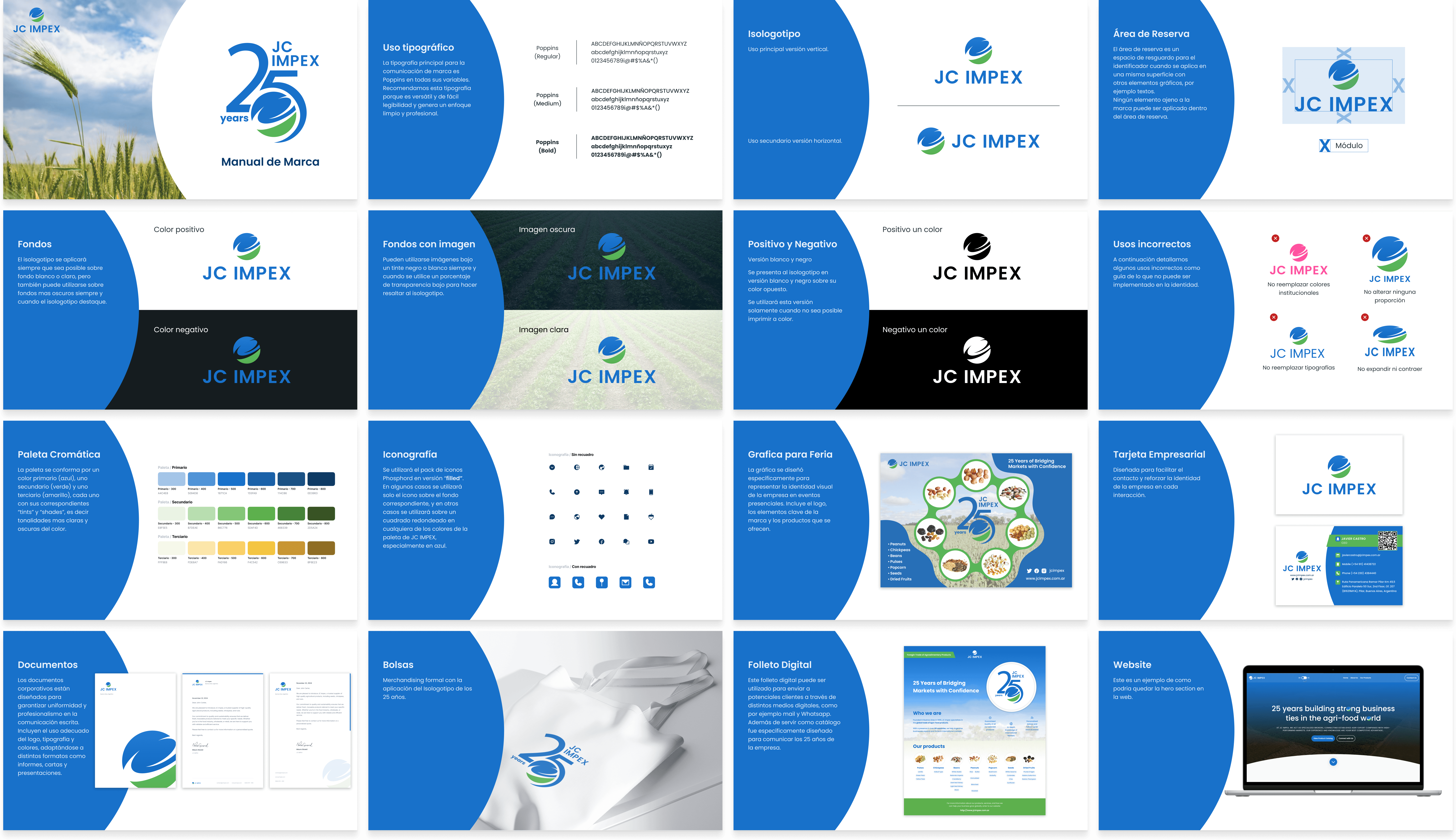 The new identity reflects JC IMPEX’s values of trust, quality, and global projection through a clean geometric logo and a refreshed color palette. A complete brand book was created to ensure consistent application across all platforms, from printed materials to digital communications.
